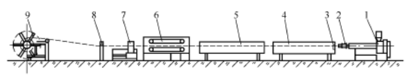 Şekil 1'de görülebileceği gibi, boru ekstrüzyon aşağı akış ekipmanı esas olarak soğutma suyu tankından oluşur,çekme ünitesi, kesici, sarıcıveya döküm masası.
